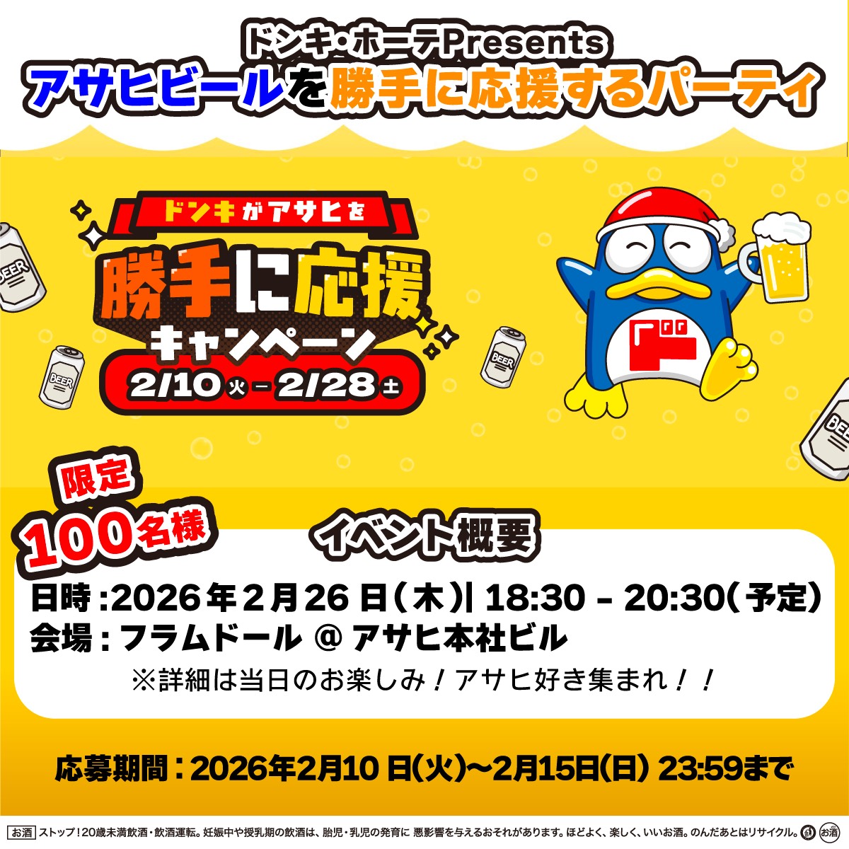 イベント 100名様を無料ご招待!2月26日(水)に「ドン・キホーテPresents アサヒビールを勝手に応援するパーティ」が開催されます 2026/02/10 9 X Facebook Hatena LINE アサヒ好き、あつまれ…!!🍺✨ドンキが“勝手に”アサヒビールを応援するスペシャルパーティを開催します🎉 アサヒ本社ビル内の会場で、大好きなアサヒビールを片手に語り合ったり、クイズで盛り上がったり…! お申込み先着順で、100名様を無料ご招待 🍻アサヒ愛あふれる特別な夜を一緒に楽しみましょう! #ドンキがアサヒを勝手に応援 【開催概要】日程:2026年2月26日(木)時間:18:00受付開始/18:30〜20:30メニュー:フリードリンク+ブッフェ料理主催:株式会社パン・パシフィック・インターナショナル企画協力:JUAST 運営サポート:株式会社REGALO 【会場】フラムドール(アサヒ本社ビル内)東京都墨田区吾妻橋1-23-1 スーパードライホール1・2F050-5484-2046地下鉄銀座線 浅草駅 徒歩5分東武伊勢崎線(東武スカイツリーライン) 浅草駅 徒歩5分都営浅草線 浅草駅 徒歩5※クロークのご用意はございませんので、予めご了承ください。【参加費】無料(招待制)※受付でお一人づつ、QRコードをご提示ください。 【募集人数】100名様※先着お申込み順となりますので、定員になり次第締め切り致します。お申し込みはこちらから 【応募期間】2026年2月10日(火)〜2月15日(日)23:59まで※定員になりましたら募集期間終了前に締め切りになる可能性がございますので、何卒ご了承ください。 【コンテンツ】✅ みんなでアサヒで乾杯🍻✅ クイズ大会でアサヒ商品をGET🎁✅ ドンペンやスペシャルゲストも登場…!? 【キャンペーンのご案内】ドン・キホーテの店舗で対象のアサヒビールを買うと、抽選でプレゼントが当たるチャンス!https://donki-katteni-cp.com/ 【注意事項】当イベントにご参加いただく場合、下記の注意事項に同意したものとみなします。予めご了承ください。・Peatixで申し込み後のチケットは他人への譲渡が可能です。・都合によりイベント内容が変更になる場合がございます。予めご了承ください。また、開始時間を過ぎてのご来場の場合、一部プログラムに参加できない可能性があります。・車を運転される方、未成年の方はご参加いただけません。(会場に駐車場はありません)・イベント開催中は公式カメラによる撮影を行います。撮影した写真は運営レポート等に使用する場合がございますので予めご了承ください。・適量飲酒を心掛け、水分補給をしながら飲みすぎにはご注意いただきながらお楽しみください。・妊娠中や授乳中の飲酒はご遠慮ください。・トラブルにつながる行為を発見した場合は退場いただく場合がございますのでご注意ください。・貴重品の管理は各自でお願いいたします。紛失・盗難について主催者は責任を負いかねます。・フード提供に関して、アレルギー対応は個別に行っておりません。予めご了承ください。