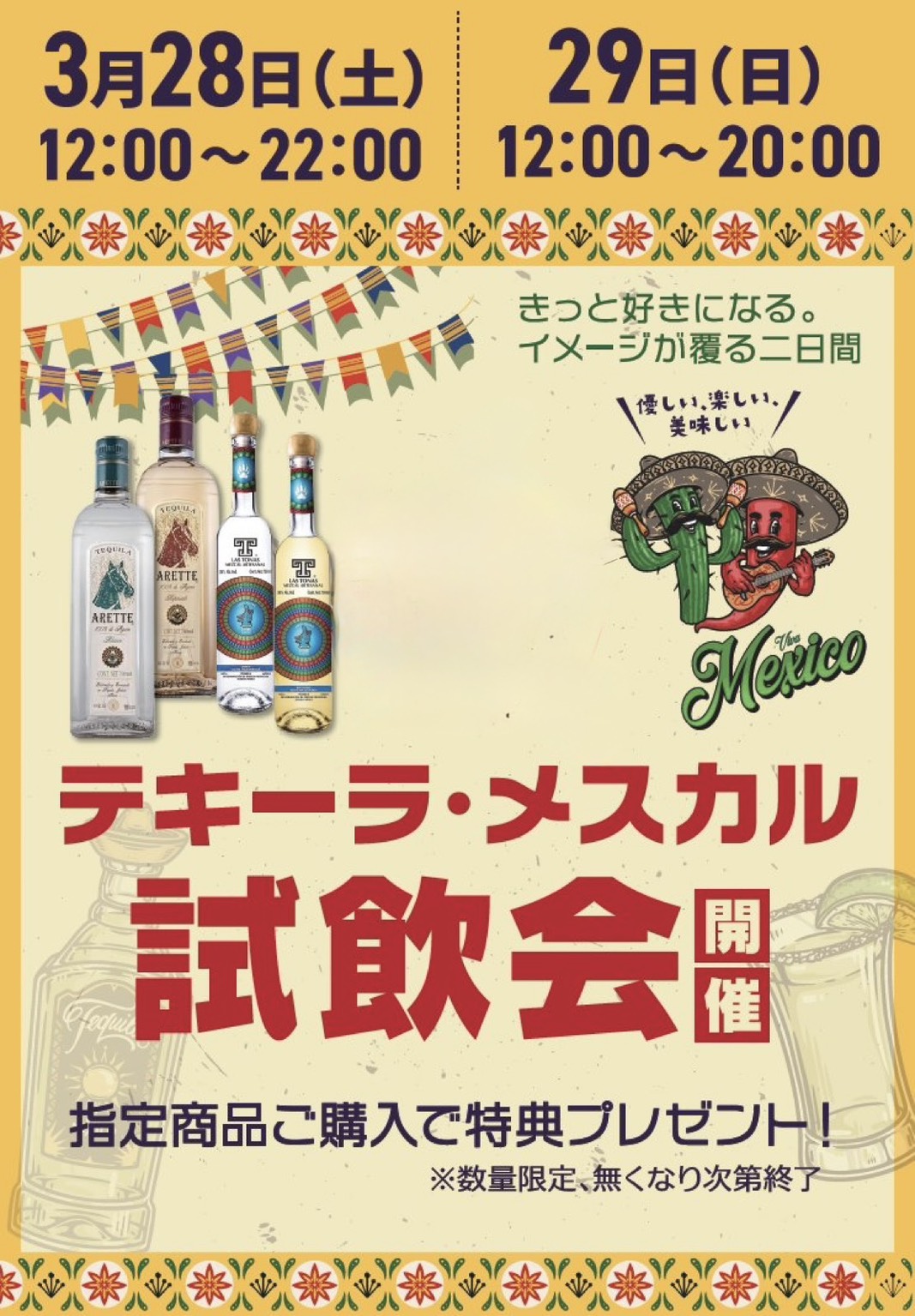 ニュース 3月28・29日(土日)にビックカメラ新宿東口店1Fで「テキーラ」「メスカル」の試飲会を開催。 2026/03/25 6 X Facebook Hatena LINE ビックカメラ新宿東口店 1Fで、メキシコを代表するスピリッツ「テキーラ」「メスカル」の試飲会が開催されます。 今回は、ジェイドックス取り扱いブランドのテキーラ・メスカルをご用意。普段なかなか体験できない、本場の味わいを気軽に楽しめる2日間です。 それぞれ個性の異なるテキーラとメスカルを各2種類ご用意し、飲み比べを通してその魅力を体感いただけます。 👉 テキーラやメスカルの新しい楽しみ方をご提案👉 初心者の方も大歓迎 「テキーラってショットで飲むものじゃないの?」「メスカルってスモーキーで難しそう…」 そんなイメージがきっと変わるはず。優しく、楽しく、美味しい——新しい発見に出会える機会です。 さらに、対象商品をご購入いただいた方には特典プレゼントもご用意。※数量限定のため、なくなり次第終了となります ぜひこの機会に、メキシコの奥深いスピリッツの世界を体験してみてください! ≪概要≫日時3月28日(土)12:00〜22:003月29日(日)12:00〜20:00 場所ビックカメラ新宿東口店 1F ライオン口 特設会場住所: 〒160-0022東京都新宿区新宿3-26-10電話: 03-5312-1111